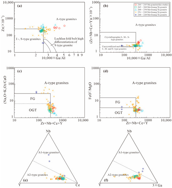 Plots of (a) 10,000 × Ga/Al versus Zr, (b) 10,000 × Ga/Al versus (Zr + Nb + Ce + Y), (c) (Zr + Nb + Ce + Y) versus (Na2O + K2O)/CaO, (d) (Zr + Nb + Ce + Y) versus (FeOT/MgO), (e) Nb-Y-Ce, and (f) Nb-Y-3 × Ga for granite from Darongshan–Shiwandashan, southeast Guangxi. Data sources are the same as in Figure 6.