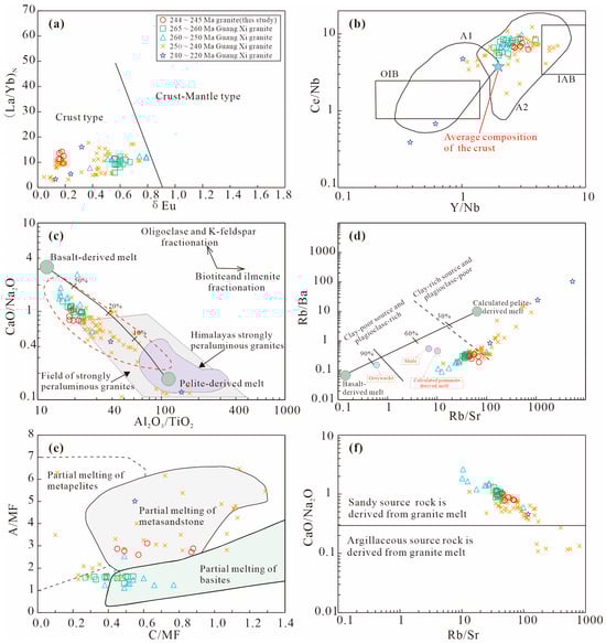 Plots of (a) δEu versus (La/Yb)N, (b) Y/Nb versus Ce/Nb, (c) Al2O3/TiO2 versus CaO/Na2O, (d) Rb/Sr versus Rb/Ba, (e) C/MF versus A/MF, and (f) Rb/Sr versus CaO/Na2O for granite from Darongshan–Shiwandashan, southeast Guangxi. Data sources are the same as in Figure 6.