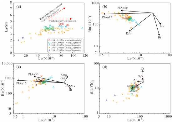 Plots of (a) La versus La/Sm, (b) La versus Rb, (c) La versus Ba, and (d) La versus (La/Yb)N for granite from Darongshan–Shiwandashan, southeast Guangxi. Data sources are the same as in Figure 6. Pl—plagioclase; Kfs—K-feldspar; Bt—biotite; Ms—muscovite; Amp—amphibolite; Grtgarnet; Zr—zircon; Sph—sphaerocobaltite; Ap—apatite; Allan—allanite; Monmonazite.