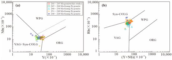 Plots of (a) Y versus Nb and (b) Y + Nb versus Rb of granite from Darongshan–Shiwandashan, southeast Guangxi. Data sources are the same as in Figure 6.