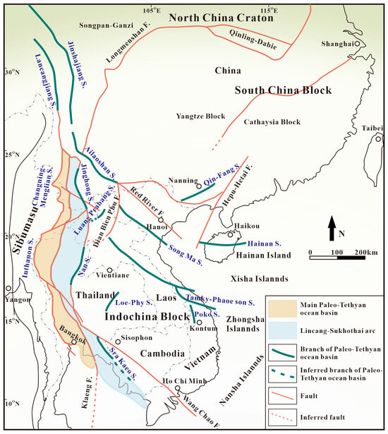 - Sone, M.; Metcalfe, I. Parallel Tethyan Sutures in Mainland Southeast Asia: New Insights for Palaeo-Tethys Closure and Implications for the Indosinian Orogeny. Comptes Rendus Geosci. 2008, 340, 166–179. [Google Scholar] [CrossRef]