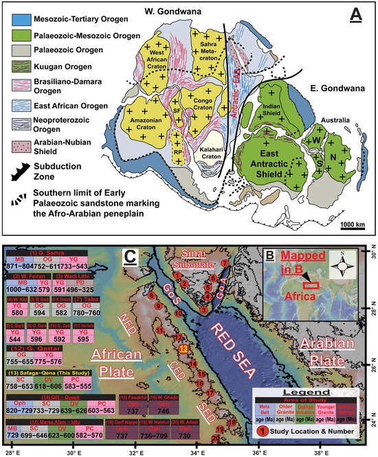 (A) The EAO and the ANS within the framework of the Gondwana assemblage (modified from [13]), where SF is the São Francisco craton and RP is the Rio de la Plata craton. (B) The location of the northern ANS (represented in (C)) is within the frame of Africa, Arabia, and Eurasia. (C) Location map for the Egyptian ANS with previous key dating results (modified from [14]). OG is Older Granites, YG is Younger Granites, DV is Dokhan Volcanics, and PD is Phanerozoic dyke. G. Samra [14], Feiran area [6,15,16], Wadi Kid [17], Wadi Nasib and Wadi Ghazalla [18], Wadi Lithi [19], Taba area [20], Gabal Gharib [21], Marsa Alam–Idfu [13], Gabal Dara, Gabal Zeit, Gabal Abu Harba, and Gabal Qattar [22,23], Qift–Quseir [24], Fawakhir, Ghadir, Gerf Nappe, and Haimur [25], and Wadi Allaqi [26].