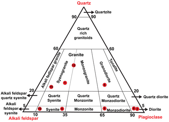 The collected granitoids along the Safaga–Qena transect were plotted on the IUGS quartz (Q)–alkali feldspar (A)–plagioclase (P) diagram for plutonic rocks (Figure 3). Samples are plotted on the corresponding fields based on the apparent QAP percentage in hand specimens (Figure 3).