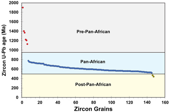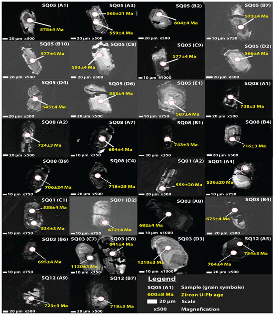 Xenocrysts with pre-Pan-African ages (Paleo-Mesoproterozoic) were detected in three different samples (SQ03: grains C7 and D3; SQ08: grains B9 and C2; and SQ12: grains C9 and D6), yielding ages of concordance of 1130 ± 15 Ma, 1210 ± 18 Ma, 1879 ± 22 Ma, 1401 ± 25 Ma, 1385 ± 12 Ma, and 1232 ± 27 Ma, respectively (Table 3; Figure 9). Zircon grains with comparable ages are progressively identified in modern research on the magmatic rock suites of the juvenile ANS [7,14,18,22,25] and clastic sedimentary rocks [54]. These xenocrysts raise doubts concerning the probability of a former occurrence and removal of pre-Pan-African crust [54].