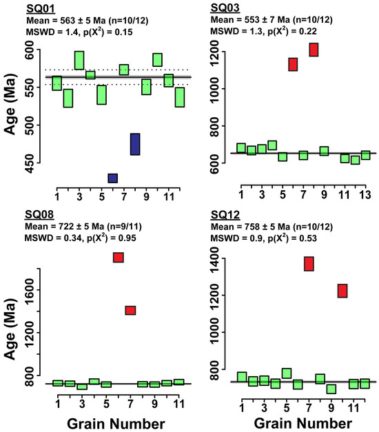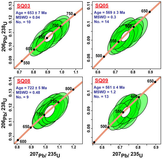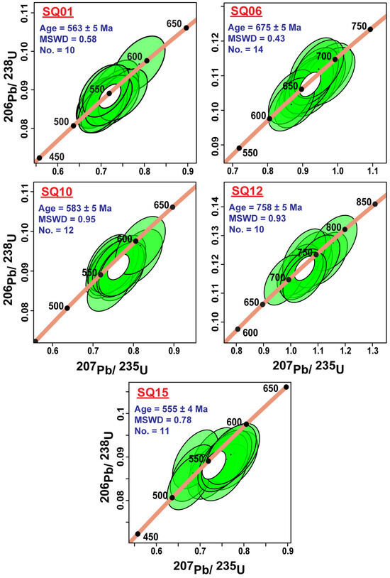 For Sample SQ01 (Figure 2), a total of 13 zircon grains were analysed (Table 3). These grains exhibited varying degrees of transparency, ranging from clear to yellow, and were primarily prismatic in shape with well-formed euhedral faces. The average ratio between grain length and width was approximately 3:1. Most grains contained inclusions, and nearly 70% displayed prominent cracks. The isotopic ratios of Th/U varied between 0.19 and 0.64, with an average value of about 0.35 (Table 3). Grain A7, which showed discordance exceeding 10%, was excluded from the age determination and interpretation processes. All other grains were clustered on the Concordia, and grains C6 and D2 produced younger ages of concordance of 430 ± 6 Ma and 475 ± 14 Ma, respectively (Figure 5, Table 3). The remaining 10 crystals represented a unified population of an age of concordance of 563 ± 5 Ma (Figure 6), calculated using IsopltR [95]. The 563 ± 5 Ma age is interpreted as the formation age for the SQ01 syenogranitic sample (Figure 2; Table 1).