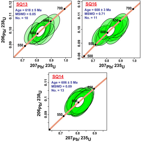 An inherited zircon grain was observed in Sample SQ15 (grain E1), yielding an age of concordance of 735 ± 7 Ma (Table 3), which is consistent with published studies suggesting a reworked nature of the ANS magmatic intrusions [7,14,18,22,23].