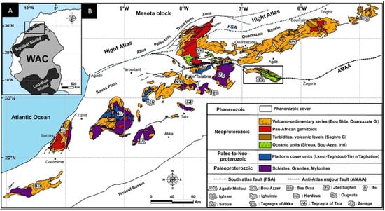 Geological map of the Anti-Atlas belt. (A) Inset showing the location of the Anti-Atlas belt within the West African Craton framework (WAC). (B) Geological map of the Anti-Atlas (modified from [].
