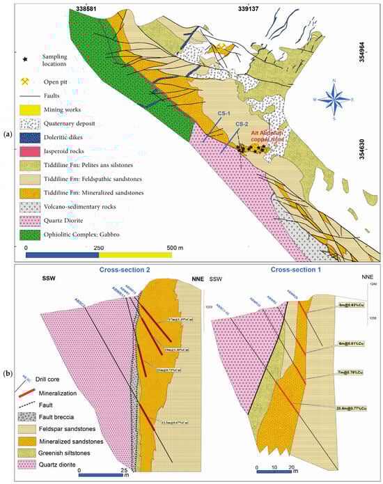 The Aït Abdellah copper mine is situated within a structurally complex zone where mineralized sandstones of the Tiddiline Formation (Figure 3a) are dissected by faults and shear zones trending ENE–WSW, WNW–ESE, and NW–SE (Figure 4a). The emplacement of doleritic dikes with NE–SW to ENE–WSW orientations likely influenced the thermal and chemical evolution of the system. Field mapping and underground data indicate that the copper mineralization is hosted in lens-shaped ore bodies reaching approximately 100 m in extension, with grades ranging from 0.8 to 1.2% Cu, and an estimated resource potential of 5 million tonnes (5 MT). These ore bodies are primarily developed within sandstone and siltstone units (Figure 3b). This is illustrated in Figure 3a,b, which show representative cross-sections and field exposures of the mineralized structures, highlighting their geometry and structural control.