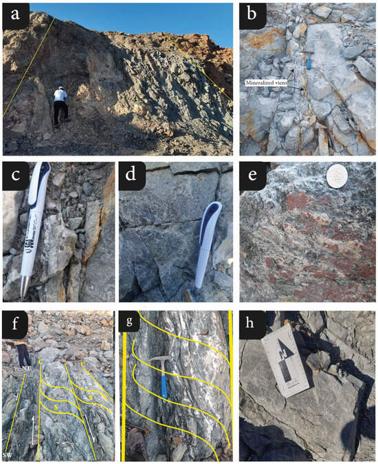 Field photographs: (a) Outcrop of the shear zone at the Aït Abdellah deposit, (b,c) mineralized quartz vein, (d) mineralized sandstones (e) hematite hosted in gabbro at the sandstone contact, (f,g) S-C fabric indicating dextral shear zone motion, (h) sandstone with disseminated bornite mineralization.