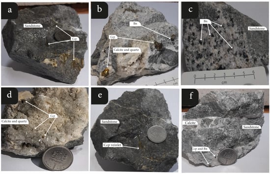 Hand specimen samples showing: (a,b) chalcopyrite in quartz gangue, (c) disseminated bornite mineralization, (d) quartz geode with chalcopyrite crystals, (e,f) quartz and calcite veins mineralized with chalcopyrite and bornite.