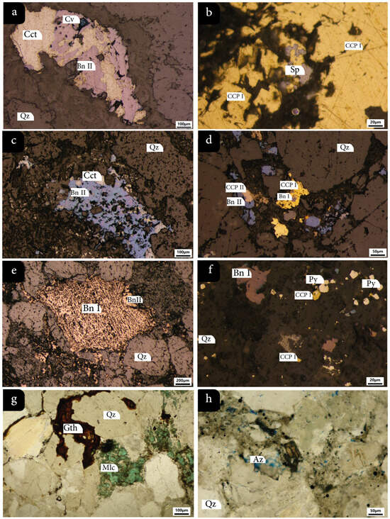 The Aït Abdellah deposit displays a complex paragenetic sequence characterized by two distinct stages of sulfide mineralization. The early stage is dominated by pyrite (Figure 6f), chalcopyrite I, and bornite I (Figure 6e). In contrast, the later stage introduces a suite of secondary sulfides, including late-stage chalcopyrite II (Figure 6b–d), bornite II, chalcocite, covellite (Figure 6a), and digenite, in addition to supergene phases such as malachite (Figure 6g), azurite (Figure 6h), chrysocolla, and iron oxides. Mineralization is manifested in multiple forms, encompassing vein-hosted, disseminated, and stockwork styles. Disseminated sulfides are spatially associated with quartz-carbonate veins that form a dense network of mineralized fractures and veinlets hosted within feldspathic sandstones and carbonate rocks.
