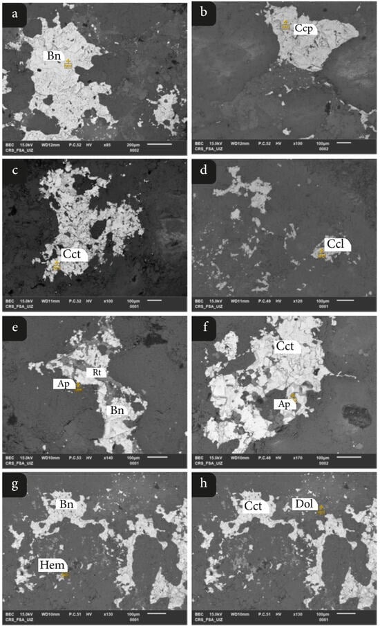 Backscattered electron (BSE) images illustrating the mineral associations and their textural relationships. (a): disseminated bornite mineralization; (b): disseminated chalcopyrite mineralization; (c): chalcocite mineral; (d): chrysocolla mineral; (e,f): traces of apatite minerals; (g): hematite mineral; (h): chalcocite within dolomites. Abbreviations: Bn—bornite, Ccp—chalcopyrite, Cct—chalcocite, Ccl—chrysocolla, Rt—rutile, Ap—apatite, Dol—dolomite, Hem—hematite.