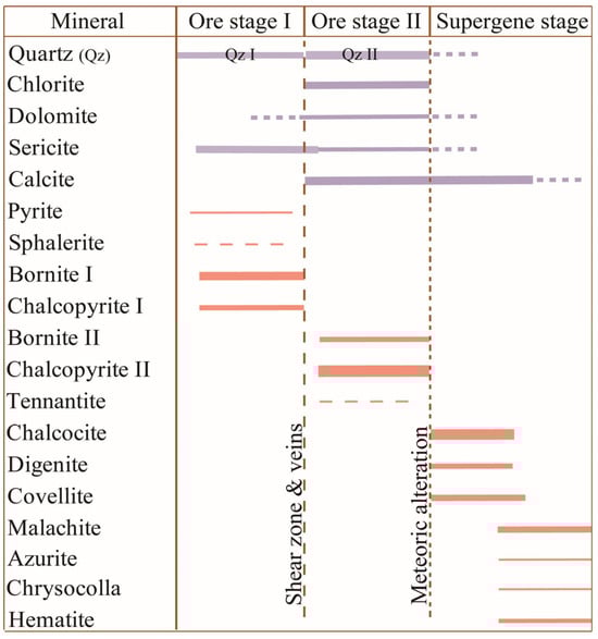 The paragenetic sequence of the Aït Abdellah copper deposit, based on mineralogical investigations and textural relationships, is composed of three distinct ore stages (Figure 8). The first stage is characterized by the precipitation of hydrothermal minerals such as quartz, dolomite, and sericite, indicating the circulation of fluids rich in silica and carbonates. During this phase, pyrite, trace amounts of sphalerite, and the first generations of bornite (I) and chalcopyrite (I) are formed, suggesting a sulfur- and base metal-rich environment under medium- to high-temperature conditions.