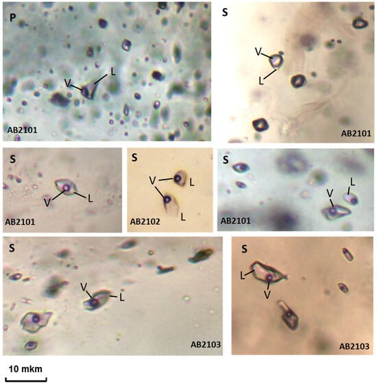 Photomicrographs of fluid inclusions in quartz. P: Primary; S: Secondary; L: Liquid; V: Gas bubble.