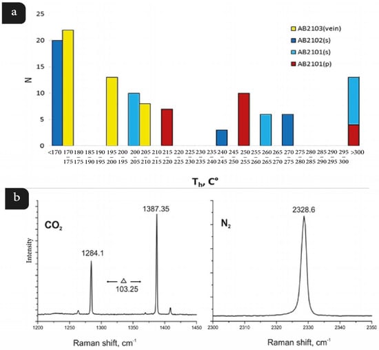 Raman spectroscopy of the inclusions identified CO2 and N2 in the gas bubbles, with CO2 exhibiting a shift difference (∆) that corresponds to a density of 0.135 g/cm3 (Figure 12) [,]. Secondary inclusions in the quartz-calcite vein (AB2103) exhibited irregular or elongated shapes and relatively low Th values ranging from 174 °C to 208 °C, alongside high salinity levels. The eutectic temperature of these inclusions ranged from −60 °C to −56 °C, with Tm ice at −21.1 °C, indicating a salinity of 23.16 wt.% NaCl equiv. (cf. []) (Table 3). Raman spectroscopy did not detect any volatiles, such as CO2 or N2, in the gas bubbles of these inclusions.