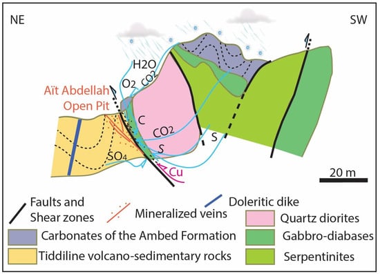 The Aït Abdellah copper deposit, 70 km east of Bou Azzer, is hosted within the eastern serpentinized peridotites of the Bou Azzer ophiolite, an oceanic crust remnant emplaced onto the West African Craton during the Pan-African orogeny [,,,,]. Mineralization occurs within the Tiddiline Group siltstones and feldspathic sandstones, overlying ophiolitic gabbros, volcanic-sedimentary units, and quartz diorites. The genetic link between ophiolitic sequences and copper deposits is key to understanding regional metallogeny, and previous studies suggest mineralization resulted from hydrothermal circulation along shear zones, where fluids interacted with ophiolitic and carbonate sequences to precipitate the deposit [,,,,]. However, a comprehensive geochemical, isotopic, and fluid evolution analysis remains absent.