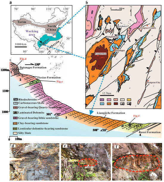 The study area is located in the Datangpo region of Songtao County, Guizhou Province, China. Geologically, it lies at the intersection of the southeastern margin of the Yangtze Block, within the Nanhua Basin, and the Jiangnan Orogenic Belt (Figure 1a,b). This extensional basin was formed as a result of the global breakup of the Rodinia supercontinent [17,18]. The basin contains a series of carbonate rocks, including rhodochrosite and dolomite [19]. The stratigraphic sequence in the study area is part of the Nanhua System (Figure 1b), which includes the following formations, listed from oldest to youngest: Liangjiehe Formation, Tiesiaoao Formation, Datangpo Formation, and Nantuo Formation [17]. An angular unconformity is observed between the Liangjiehe Formation of the Nanhua System and the underlying Banxi Group of the Qingbaikou System [17,20]. The Nantuo Formation of the Nanhua System is in para-unconformity contact with the Doushantuo Formation [21]. The low-temperature sedimentary sequence of the Nanhua System records two glacial events. The mixed rocks and sandstones of the Liangjiehe and Tiesiaoao Formations are indicative of the Sturtian glaciation (~720–663 Ma), which is characterized by poor roundness [22]. In contrast, the glaciomarine mixed rocks, siltstones, and sandstones of the Nantuo Formation document the Marinoan glaciation (~654–635 Ma), with thicknesses ranging from 60 to 200 m [19,21]. The Datangpo Formation consists of interglacial sediments deposited between the Sturtian and Marinoan glaciations. It spans approximately 10 million years (~663–654 Ma), is conformably in contact with both the underlying Tiesiaoao Formation and the overlying Nantuo Formation, and has a thickness that varies between 30 and 700 m [19].