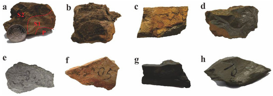 Samples collected from the study region. (a). The spheroidal weathered carbonate rock shows three distinctly different colored zones, representing the P zone, the S1 zone, and the S2 zone. (b). The weathered carbonate surface exhibits fine laminated structures. (c,d). Carbonate rocks with a yellow-brown weathering crust. (e). The sandstone from the Liangjiehe Group. (f). The sandstone from the Tiesiao Group. (g). The carbonaceous mudstone from the Datangpo Group. (h). The interior of the carbonate lens that has not been affected by weathering.