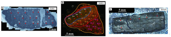 The positions of C-O isotope analysis are shown in Figure 3a–c. Each sample, approximately 200 μg, was obtained by using a dental drill in situ from the section. These powders were loaded into glass tubes, evacuated with high-purity helium, and reacted with 100% pure phosphoric acid for 24 h to convert it to CO2 [26,27,28,29]. The GasBench II system was used to introduce the gas into a Thermo Scientific MAT253 Plus isotope ratio mass spectrometer for analysis. Calibration was performed using the international standard NBS-18 (δ¹³C = −5.014‰, δ¹⁸O = −23.2‰), and the results are reported in δ units (‰) relative to the Vienna Pee Dee Belemnite (V-PDB) standard.