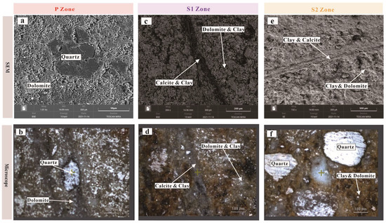 Comparative analysis of mineralogy with varying degrees of weathering. (a) SEM image of the P zone, revealing a dense matrix and quartz grains. (b) SEM image of the S1 zone, showing a more porous matrix and fractures. (c) SEM image of the S2 zone, displaying an even more porous and cavernous matrix, with the fillings in fractures resembling the matrix. Fillings in the fractures were identified as calcite through energy-dispersive spectroscopy. (d) Microscopy image of the P zone, displaying a relatively dense, bluish-gray matrix with quartz grains visible. (e) Microscopy image of the S1 zone, distinctly showing a yellowish-brown matrix with a decrease in bluish-gray dolomite minerals. (f) Microscopy image of the S2 zone, observing a significant increase in quartz grains, leading to a cloudier matrix, alongside residual milky white dolomite.