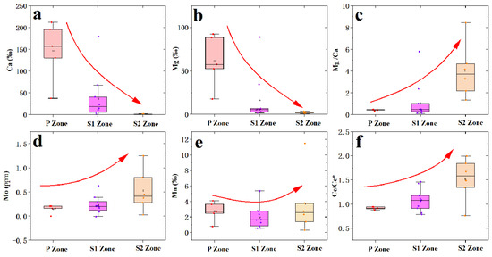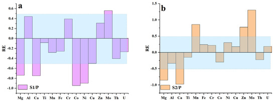 Element variation in different spheroidal weathered crust layers. (a) In the S1 zone, significant depletion of Mg and Ca elements is observed, accompanied by notable depletion of Ni and Co elements. Conversely, there is significant enrichment of Mo. (b) In the S2 zone, Mg and Ca elements continue to be significantly depleted, while Mn, Zn, and Mo elements exhibit notable enrichment.