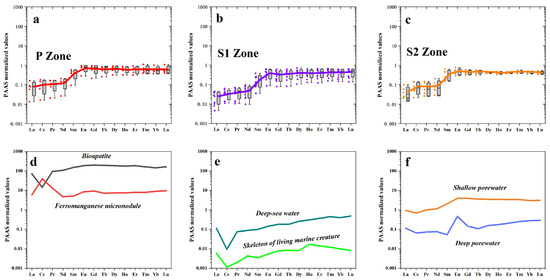 REEs patterns in different spheroidal weathered crust layers. (a) REEs pattern for the P zone. (b) REEs pattern for the S1 zone. (c) REEs pattern for the S2 zone. (d) REEs patterns of biogenic apatite and iron manganese micronodules. (e) REEs patterns of deep-sea seawater and marine biogenic skeletons. (f) REEs patterns of shallow and deep pore waters.