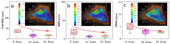 In the S1 zone, a notable depletion was observed for Mg, Ca, Co, and Ni, while significant enrichment was evident for Mo (Figure 6a and Figure 7). In the S2 zone, notable enrichment was observed for Mn, Mo, and Zn, while significant depletion was evident for Mg and Ca (Figure 6b and Figure 7). The REEs patterns in the P zone, S1 zone, and S2 zone exhibit similar trends (Figure 8), with the ratio of light REEs (LREEs) vs. heavy REEs (HREEs) varying minimally (P zone =3.74 ppm; S1 zone = 2.86 ppm; S2 zone = 3.21 ppm) (Table 1). This indicates that significant fractionation of REEs did not occur during the weathering process. The total REEs content exhibits a trend of an initial decrease followed by an increase, as evident from the REE distribution map (Figure 9). Specifically, higher REEs concentrations are observed in the P zone, which decrease in the S1 zone and then slightly increase again in the S2 zone (Table 2). The overall Ce anomaly ranges from 0.76 to 1.99. Notably, a significant increase in the Ce/Ce* ratio is observed from the P zone to the S2 zone (Figure 7f).