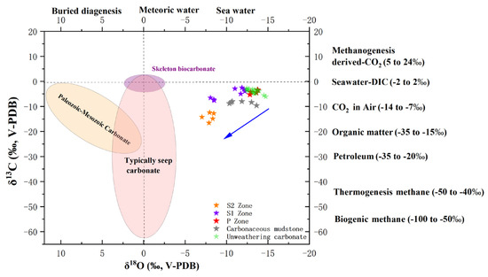 The P zone exhibited δ13C values ranging from −5.26 to −3.35‰, averaging −4.18‰, and δ18O values ranging from −13.79 to −12.83‰, averaging −13.38 ‰, consistent with the isotopic signatures of the unaltered dolomite (TJT1) (Figure 10). The S1 zone showed δ13C values ranging from −7.61 to −2.52‰, averaging −4.87‰, and δ18O values ranging from −12.22 to −8.06‰, averaging −10.49‰. S2 zone displayed δ13C values ranging from −16.56 to −12.43‰, averaging −14.17 ‰, and δ18O values ranging from −8.46 to −7.03‰, averaging −7.93 ‰ (Figure 11).