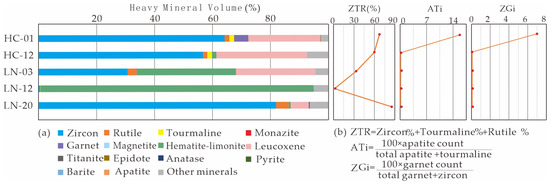 For samples HC-01 and HC-12, heavy minerals are predominantly zircon (64.11% and 56.59%, respectively; Figure 2), followed by anatase (24.65% and 31.01%). For sample LN-03, heavy minerals are primarily goethite (34.01%), with zircon (30.66%) and anatase (27.15%) also present. In sample LN-12, goethite is the dominant heavy mineral (93.72%). In sample LN-20, zircon is the main heavy mineral (81.36%).
