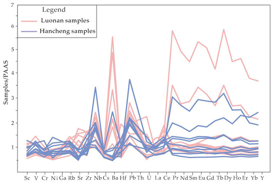 Trace element spider diagram (PAAS data from [32]; plotted with Origin 2021 software, version 9.8.0.200).