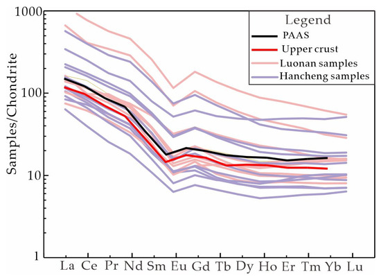 The analytical results of rare earth elements (REE) showed that the total amount of REE in the Luonan samples ranged from 106.45 × 10−6 to 1380.79 × 10−6. In contrast, LREE/HREE = 2.57–5.99 (average 4.58), with LREE being enriched and HREE being in a deficit. Eu and Lu exhibit shallow values compared to the others. From the rare earth element distribution curves (Figure 4), a significant negative anomaly can be observed (Figure 4; δEu = 0.52–0.70, average 0.59). Pronounced LREE/HREE fractionation is evident, with (La/Yb)N ratios spanning 5.12–22.28. Samples exhibit a rare earth element distribution pattern with a right-leaning negative europium anomaly similar to that of the continental crust.
