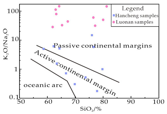 According to the K2O/(Na2O-SiO2) (Figure 5) tectonic setting discrimination diagram [38], almost all Luonan samples fall within the passive continental margin field, indicating a relatively stable source region. Passive margin tectonic settings are inferred for five Hancheng samples and six samples from Hancheng, falling within the active continental margin field.