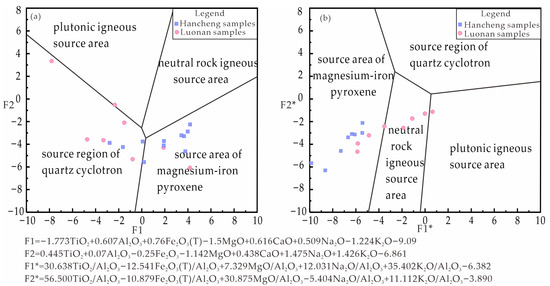 Provenance discrimination plot for the major element compositions of Luonan and Hancheng samples. (a) F1-F2 discriminant diagram for rock provenance classification, (b) F1*-F2* discriminant diagram for rock provenance classification (the base maps are modified from [39]; plotted with Origin 2021 software, version 9.8.0.200 and CorelDRAW Graphics Suite 2021 software, version 23.5.0.506).