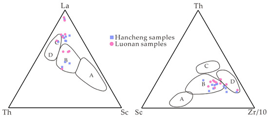Comparative provenance analysis based on major element geochemistry shows the following: Integrated major element characteristics from the Luonan and Hancheng areas reveal distinct source-to-sink system evolutionary pathways. Luonan provenance is dominated by felsic rocks typical of cratonic or stable continental margin settings, as evidenced by elevated SiO2/Al2O3 and K2O/Na2O ratios, and strong chemical weathering signatures (CIA > 80) are likely derived from Proterozoic basement rocks exposed along the southern margin of the TNCO. Hancheng provenance exhibits hybrid source characteristics with predominant felsic components (SiO2 > 65%), and subordinate inputs from intermediate-acidic volcanic rocks or metamorphic lithologies reflect localized Mesozoic tectonic-magmatic overprinting, possibly associated with subduction-related arc magmatism and intracontinental reactivation events. The trace element characteristics of the Luonan and Hancheng areas reveal distinct geological signatures, as follows: Luonan exhibits high La/Sc and Th/Sc ratios, consistent with passive continental margins or stable intracratonic sedimentary basins. In contrast, Hancheng samples exhibit low Th/Sc and moderate La/Sc ratios, indicative of an active continental margin or island arc environment, with source rocks likely derived from Late Paleozoic metamorphic basic rocks in the Qinling Orogenic Belt.
