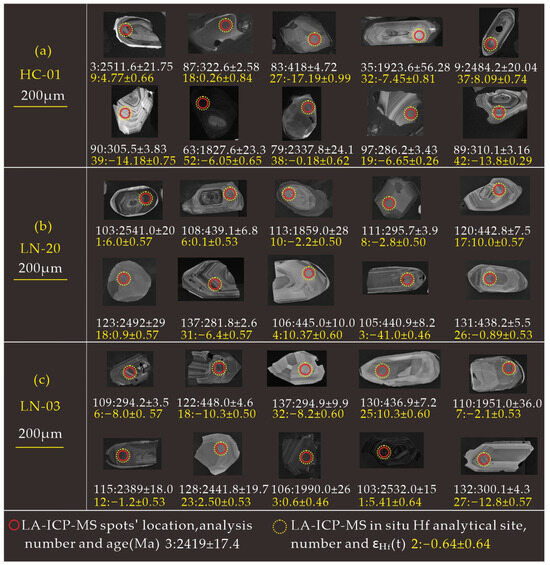 For sample LN-03, the U-Pb ages of 137 zircons (n = 137) were geochronologically analyzed (one spot per grain), with 32 of these analyses extended to Lu-Hf isotopic characterization to constrain source terrane evolution. Among these, 103 zircon grains yielded concordant ages. A total of 103 zircon U-Pb ages were acquired from the LN-03 sandstone samples. These zircons reveal the following three prominent age peaks: the first group spans from approximately 235 Ma to 450 Ma and features peaks around 300 Ma and 437 Ma (Figure 10c); the second group covers an age range from about 1663 Ma to 2079 Ma and exhibits peaks at 1945 Ma; and the third group spans from approximately 2237 Ma to 2555 Ma, exhibiting a peak at approximately 2517 Ma. The zircons in the first group have a Th/U ratio from 0.33 to 1.22, with four falling below 0.4, indicating a predominantly magmatic origin for these zircons. In the second group, Th/U values from 0.06 to 2.58 were observed, including two values below 0.1 and three zircons between 0.1 and 0.4. The third group has Th/U values from 0.22 to 1.45, with two spots < 0.4, suggesting mid-stage metamorphic overprinting with varying intensities in a subset of zircons. Additionally, sample LN-03 contains two zircons with Th/U < 0.1. These zircons provide ages of 1777 Ma and 1937 Ma, indicating that the zircon grains underwent varying degrees of metamorphic alteration during earlier and later periods.