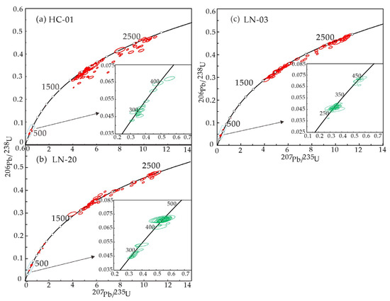 In calculating εHf(t) and TDM2, the values for modern chondrites are cited from [22]. For the depleted mantle, the specific values can be found in another research study [23]. The decay constant for 176Lu (λ) is taken as 1.867 × 10−11 a [24]. TDM2 is calculated using the upper crust values of 176Lu/177Hf = 0.0093, with an fLu/Hf of −0.72 [25]. In contrast, for the depleted mantle, an fLu/Hf of 0.16 is used [23]. The formulas for calculating εHf(t), TDM2, and fLu/Hf are based on another study [26], with the operating conditions described by the authors of [27]. The results are listed in Tables S3 and S4 in the Supplementary Materials.