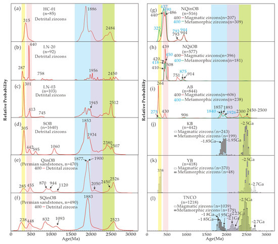 Results of detrital zircon U-Pb age histograms. (a) Age spectrum of Sample HC-01 from the study area, (b) Age spectrum of Sample LN-20 from the study area, (c) Age spectrum of Sample LN-03 from the study area, (d) Age spectrum of SOB, (e) Age spectrum of QinOB, (f) Age spectrum of SQinOB, (g) Age spectrum of NQinOB, (h) Age spectrum of NQiOB, (i) Age spectrum of AB, (j) Age spectrum of KB, (k) Age spectrum of YB, (l) Age spectrum of TNCO. Only the ages with lower than 10% discordance were used. The yellow, pink, blue, gray, and green bars show the age groups of 350–268 Ma, 520–386 Ma, 2000–1600 Ma, 2300–2000 Ma, and 2600–2300 Ma, respectively. (a–c) show data from this study. The detrital zircon ages of the SQinOB are from the authors of [41,42]; the magmatic zircon and metamorphic zircon ages of the NQinOB, Trans–North China Orogenic Belt (TNCO), NQiOB, Alxa Block (AB), Khondalite Belt (KB), and Yinshan Block (YB) are from the authors of [43] and the references therein; the detrital zircon ages of the QinOB and southern Ordos Basin (SOB) are from the authors of [43] and the references therein; and the LN-03, LN-20, and HC-01 data are from this study. The relative probability curves were drawn with the DensityPlotter program (version 8.5), using the kernel density estimation model (KED). The width of one column in (j–l) is 25 Ma. Plotter with Density Plotter software, version 8.5 and CorelDRAW Graphics Suite 2021 software, version 23.5.0.506.