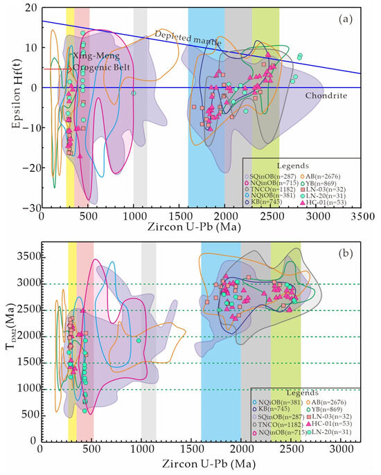 εHf(t) values vs. U-Pb ages (a) and TDM2 vs. U-Pb ages (b). The yellow, orange, blue, gray, and green bars show the age groups of 350–268 Ma, 520–386 Ma, 2000–1600 Ma, 2300–2000 Ma, and 2600–2300 Ma, respectively. The SQinOB data are from the authors of [41,42]; the NQinOB, Trans–North China Orogenic Belt (TNCO), NQiOB, Khondalite Belt (KB), Yinshan Block (YB), and Alxa Block (AB) data are from the authors of [43] and the references therein; the LN-03, LN-20, and HC-01 data are from this study. Data on depleted mantle from [23]. Plotted with Origin 2021 software, version 9.8.0.200 and CorelDRAW Graphics Suite 2021 software, version 23.5.0.506.