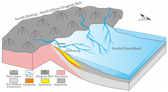 Luonan lies to the north of NQinOB (Figure 1a), while the Ordos Basin lies to the north of the Luonan–Luanchuan Fault Zone (Figure 1b). The two regions are geographically adjacent, with the Ordos Basin forming the northern boundary and Luonan positioned to the south. During the Late Early Paleozoic (440–420 Ma), the closure of the North Qinling Ocean resulted in a collision between the North China Block and the Qinling terrane. The uplift associated with this phase provided recycled orogenic materials to the Middle Permian Shihezi Fm in the Luonan area along the southern margin of the North China Block [9]. From the Carboniferous to Permian, tectonic activity along the Shangdan Fault Zone between the North China Block and the Yangtze Block induced rifting processes, resulting in the formation of an intermontane rift basin in the Luonan region. The Shihezi Fm was deposited in this extensional environment [10]. By the Middle Permian, a collision between the North China Block and the Qinling terrane resulted in the rapid exhumation of NQinOB, accompanied by diminished sediment supply from South Qinling. Consequently, the provenance of the Shihezi Fm shifted to dominantly intermediate–felsic igneous rocks, low-grade metamorphic rocks, and sedimentary rocks derived from the NQinOB, reflecting stage-specific variations in tectonic dynamics [11,12]. The stratigraphy of the Luonan area mainly includes Precambrian–Mesozoic units.