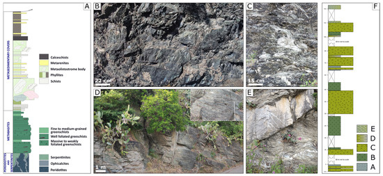 Main lithological features of the Gimigliano ophiolite succession. (A) Representative composite log of the Gimigliano ophiolite succession measured in the Gimigliano area (not to scale). (B) Metaultramafic rocks formed of serpentinites. (C) Ophicalcites found in closed association with serpentinite showing a brecciated fabric. (D) Metabasite layers characterized by a strong foliation. Image bounded by white dotted line in the upper right corner shows foliation details. (E) Marble olistolith in a strongly foliated metapelite to metarenite bed. (F) Detailed representative log of the Gimigliano metabasites. Letters correspond to the lithofacies of Table 1. The scale is in meters.