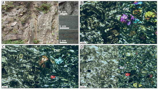 Lithofacies B. (A) Field image of tabular layers characterized by a compact, massive (upper and middle close-up view) to lightly foliated texture (lower close-up view), featuring green hues, bluish tints, and whitish speckles. (B) Thin-section photomicrograph characterized by a lepido-nematoblastic dominated by chlorite wrapping porphyroblasts of epidote (Ep). Plane (left) and crossed (right) polarized light. (C) Thin-section photomicrograph characterized by a lepido-nematoblastic texture of chlorite (Chl), quartz (Qz), and plagioclase with porphyroblasts of epidote (Ep). Plane (left) and crossed (right) polarized light. (D) Thin-section photomicrograph showing a fine-grained groundmass composed of quartz and plagioclase, with minor chlorite, embedding porphyroblasts of epidote (Ep). Plane (left) and crossed (right) polarized light.