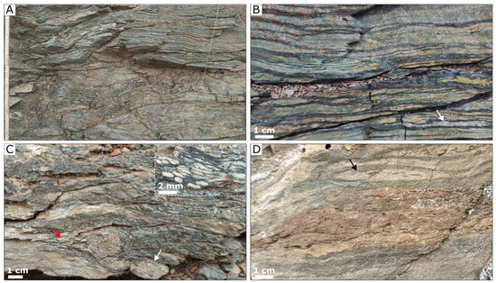 Lithofacies D occurs in the uppermost part of the studied succession (Figure 2F) with a cumulative thickness of ca. 150 cm. It consists of a fine- to medium-grained, compact, and well-foliated rock, characterized by an intense green color with variations from dark green to greenish-gray tonalities (Figure 7A). It displays a distinct silvery luster, with a silky sheen, particularly evident along the schistosity planes, and a soapy feel on the foliation surface. The grain size varies, with a predominantly fine-grained matrix transitioning to coarser zones, where larger, generally lamellar mineral crystals are visible. The foliation is well developed, with alternating lighter and darker bands, typically forming tight layering from parallel to undulating layers. However, in some areas, the texture appears more massive, partially obscuring the schistosity. Minor clasts and particles of slightly different composition and whitish color, ranging from millimetric to a few centimeters in size, are wrapped into the foliation. Qualitative XRD analyses reveal a mineralogical assemblage of muscovite, quartz, albite, ferronian clinochlore, and epidote.