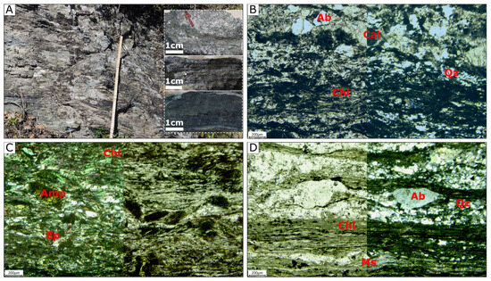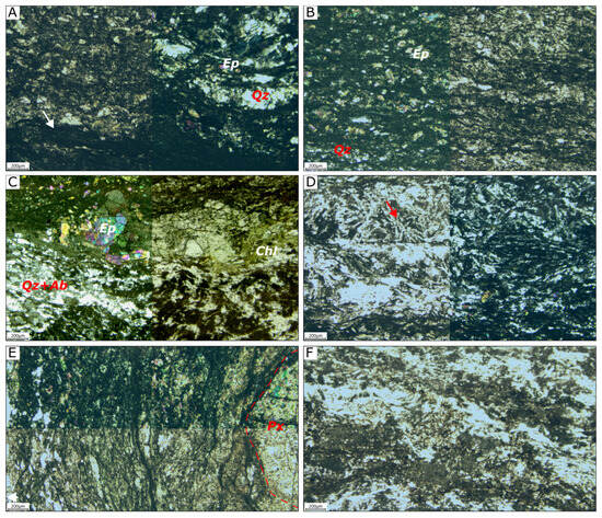 Based on microscopic observations, this lithofacies is very fine-grained, with a well-developed foliation determined by the segregation of dark and light sub-horizontal layers. The dark regions are mainly composed of chlorite–epidote, whereas light areas are composed of quartz–albite and epidote in small porphyroblasts (Figure 3B), constituted by the alignment of flattened or elongated elements of quartz, albite, or quartz + epidote (Figure 3C). In addition, laterally discontinuous submillimeter-thick lenses of quartz + epidote + minor albite are intercalated within the main foliation (Figure 3D).