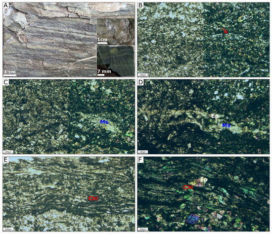 Petrographic observations show alternations of fine-grained mafic layers, composed of epidote and chlorite, and felsic layers, constituted of quartz and albite (Figure 7B). Locally, the presence of pseudofelty structures of muscovite, permeating the groundmass (Figure 7C) or wrapping coarser crystals (Figure 7D), characterizes the layers. Chlorite bands with well-developed foliation are typical of silvery luster layers (Figure 7E) and include single crystals or trains of epidote (Figure 7F). Clastic fragments, recognized at the mesoscale, are composed of a fine-grained quartz + epidote + calcite mineralogical assemblage under microscopic observations.