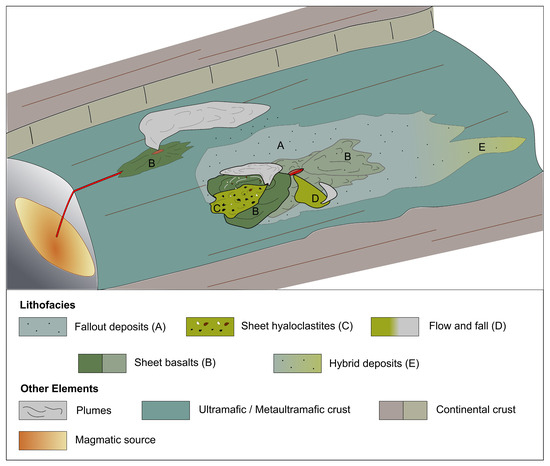 The identification of protoliths from metaeffusive and metaexplosive rocks can be extremely challenging when they share a common magmatic source and experience the same metamorphic phases, because effusive and explosive products from the same magma would share the same minero-chemical characteristics and then be involved in metamorphic transformations. Oceanic seafloor sequences are rich in basaltic lava flows, different in morphology [50], and are associated with variable amounts of hyaloclastic deposits. These deposits are generated by the interactions between rising lava and seawater [3,51] and are normally emplaced by a wide plethora of processes that generate and transport particles whose dimensions encompass the entire spectrum of particle grainsize [52,53]. Beyond those deposits, pyroclastic deposits generated by explosive activity of basaltic magma mixed with seawater are also frequently documented [1,4,5,6].