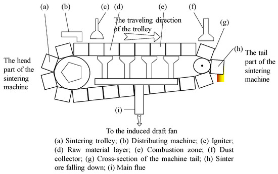 The iron ore sintering process is the second largest energy-consuming process in the iron-making industry. It uses concentrated powder, coke, and flux as raw materials to produce sinter with certain physical strength and chemical composition [11]. At present, the steel industry mainly uses belt-type suction sintering machines for production, and their structure is shown in Figure 1 [2,12].