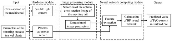 On the one hand, it is necessary to set up an industrial camera to obtain the tail section of the sintering machine. On the other hand, it is necessary to obtain the process parameters from the server of the steel plant. After obtaining the parameters of these two parts, it is necessary to comprehensively analyze them on the system host to obtain the predicted FeO content of sinter. The prediction process of sinter FeO content is shown in Figure 3.