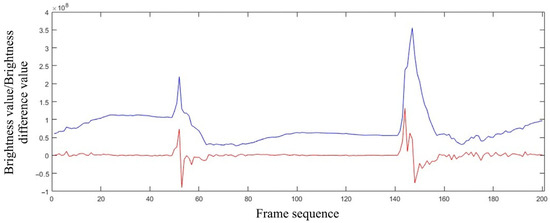 The brightness difference for the cross-section image of the machine tail is calculated within 100 s, and the result is shown in Figure 4. The blue curve in the figure is the brightness value change trend of the image sequence, and the red curve is the brightness difference value.