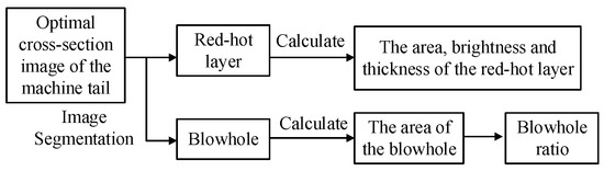 The best cross-section image cannot be used directly, so it is necessary to extract image features as the input of the neural network. The selection of image features is based on the experience of workers watching the fire. According to the investigation of workers’ experience, the following four image features are summarized as the characteristic parameters of the cross-section of the sintering machine tail. Since image processing by computer is based on digitization, it is necessary to digitize the empirical features. The extraction process of image features is shown in Figure 5.