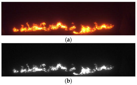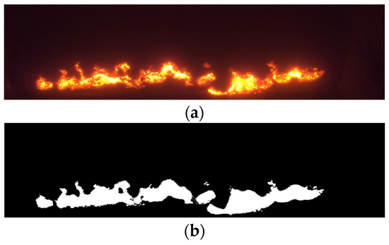 Schematic diagram of red fire layer extraction; (a) Original RGB image; (b) Binary image processed by the OTSU method.